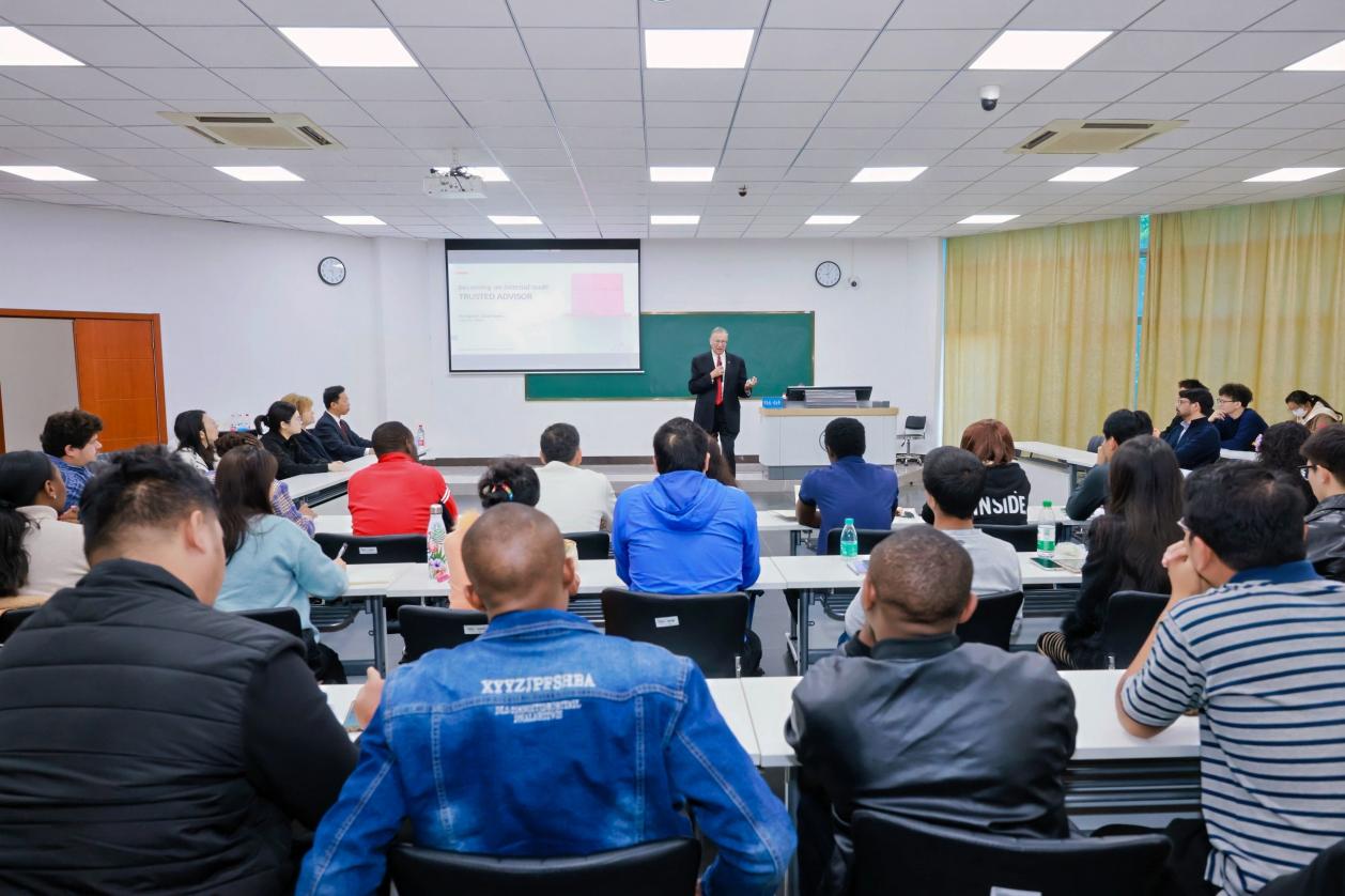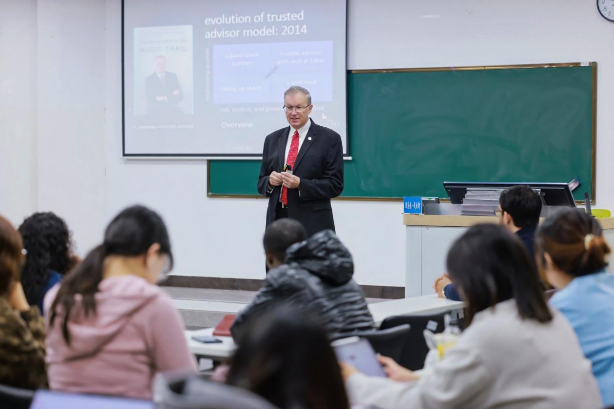 10月29日上午,“内审实务大讲堂”第一期在致明楼一楼报告厅正式启幕。我校首位海外院长、国际内部审计师协会(IIA)原秘书长兼首席执行官理查德・钱伯斯教授受邀担任首讲嘉宾,以《成为内部审计领域的可信赖顾问》为主题,为现场师生带来了一场专业且深刻的讲座。本期活动由内部审计学院副院长廖林教授主持,来自内部审计学院和审计专业硕士国际班的50余名师生参加本次讲座。